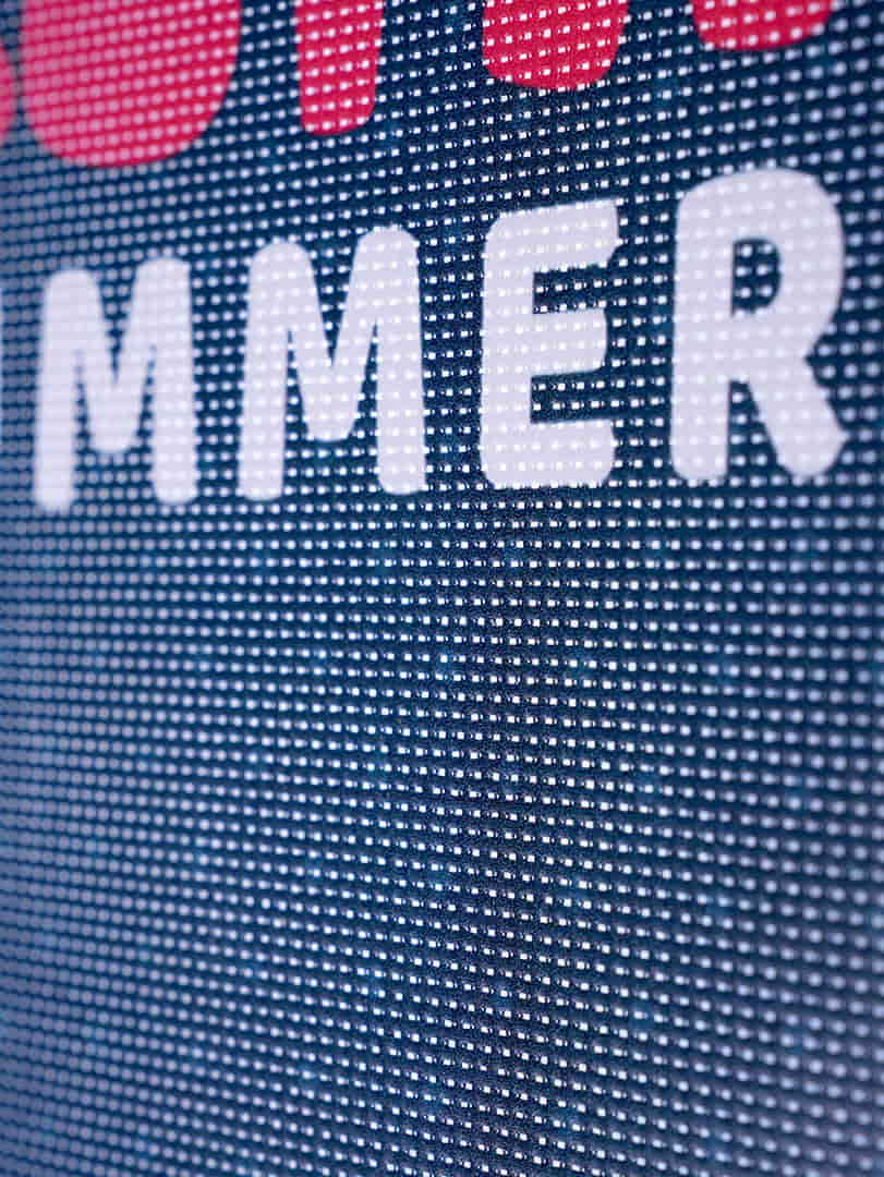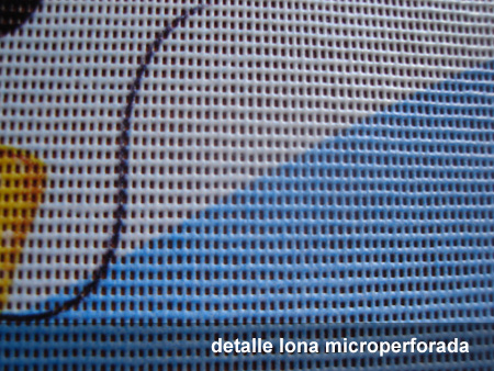 - Lona PVC microperforada 350 grms/m2: utilizada en exteriores, sus perforaciones la hacen perfecta para ser colocada en zonas con viento, evitando el efecto vela, ya que al ser tensada su efecto visual se mantiene en el tiempo.