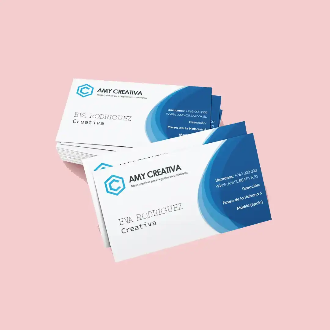 - 1000 tarjetas de visita de 8,5x5 cm, 5cm papel de 350gr, impresión a una cara, corte recto y plastificado brillo o mate.